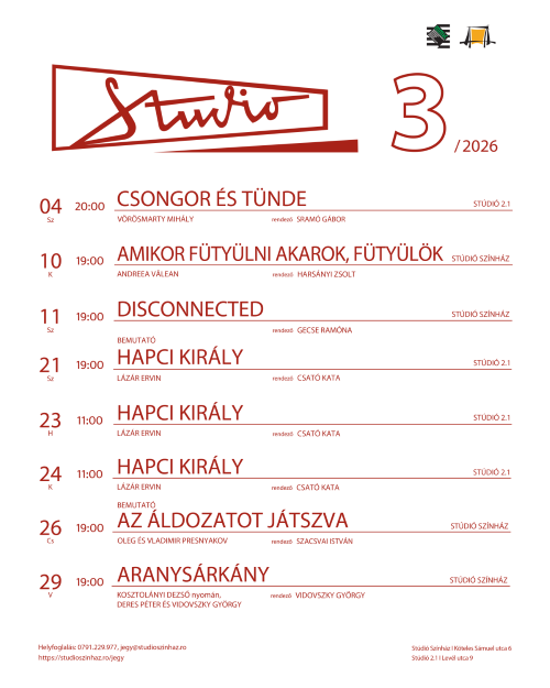 A Marosvásárhelyi Művészeti Egyetem Stúdió Színházának márciusi műsorán a következő előadások szerepelnek: Csongor és Tünde, Amikor fütyülni akarok, fütyülök, Disconnected, Hapci király, Az áldozatot játszva, Aranysárkány.