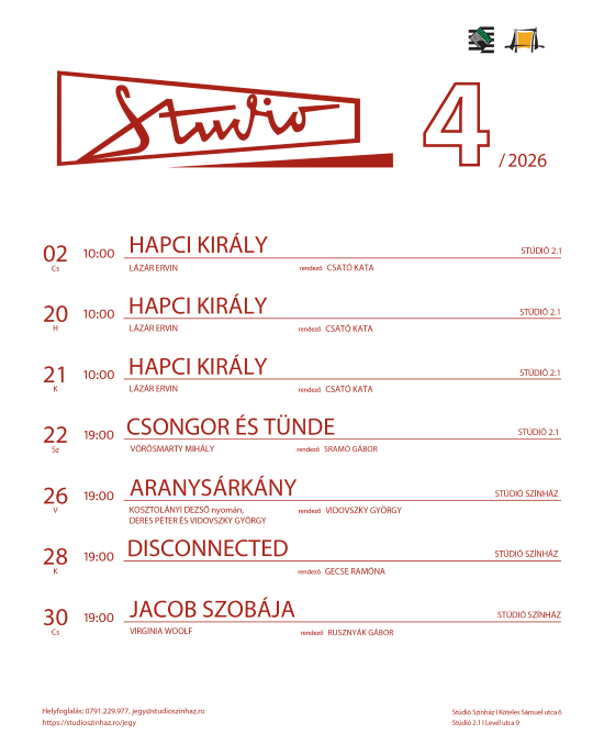A Marosvásárhelyi Művészeti Egyetem Stúdió Színházának áprilisi műsorán a következő előadások szerepelnek: Hapci király, Csongor és Tünde, Aranysárkány, Disconnected, Jacob szobája.