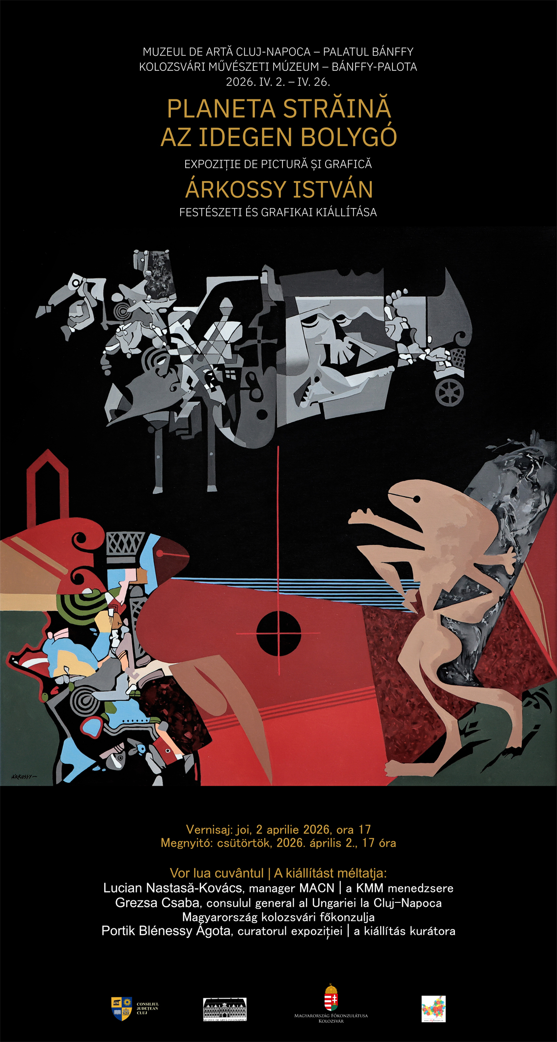 A Kolozs Megyei Tanács alárendeltségébe tartozó Kolozsvári Művészeti Múzeum 2026. április 2–26. között Árkossy István festészeti és grafikai egyéni kiállítást szervez Az idegen bolygó címmel. A kiállításmegnyitóra csütörtökön, 2026. április 2.-án, 17 […]