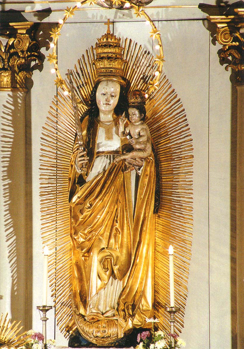 A mi szempontunkból legjelentősebb Mária-szobor az 1444 táján már épülő csíksomlyói, Sarlós Boldogasszony tiszteletére szentelt ferences kolostor ékessége lett. Csupán a méretei alapján állíthatjuk, hogy aprócska építmény az egykori, harmadikként emlegetett mellékoltár sem lehetett, aminek a szekrényében ez a 210 centiméteres szobor elfért. Méltatói ezt a szobrot és vele összefüggő, kisebb, Szent Katalint és Szent Borbálát ábrázoló társait a 16. század első negyedébe, második évtizedébe keltezik. S akkoriban keletkezhettek a velük kapcsolatba hozható bözödújfalusi, székelyszállási, csíkszentmártoni, csíkzsögödi, székelyzsombori/lövétei(?), csíkszentdomokosi, csíkszentkirályi szobrok is. Faragásmódjuk rokonítja ezeket az emlékeket a szászbogácsi, szászsebesi, brulyai, valamint egy jelenleg Nagyszebenben található Mária-szoborral is.