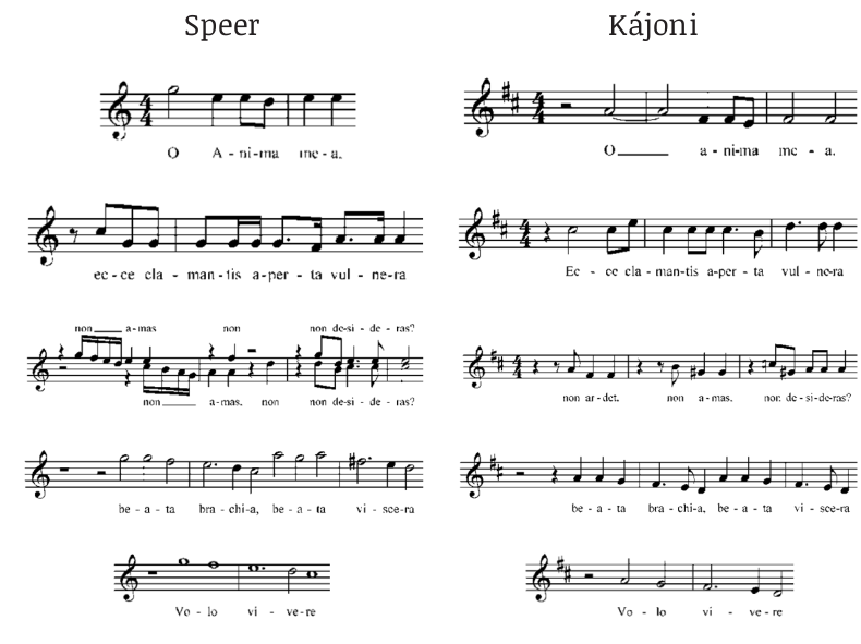 Következő példánk érdekessége, hogy szerzőjeként maga Kájoni van megjelölve. A darab önmagában is teljes értékű kompozíció, dallamanyaga azonban roppant érdekes párhuzamokat mutat legalább két nyugat-európai zeneszerző azonos szövegű kompozíciójával. Az O anima mea suspira című darab két zeneszerzőnél fordul elő szinte azonos módon. Isabella Leonarda (1620–1704) és a magyar zenetörténet szempontjából is jelentős Daniel Speer (1636–1707) kompozíciói szemmel láthatóan azonos mintára készültek azzal a különbséggel, hogy Speer négytagú vonós együttest is előír.