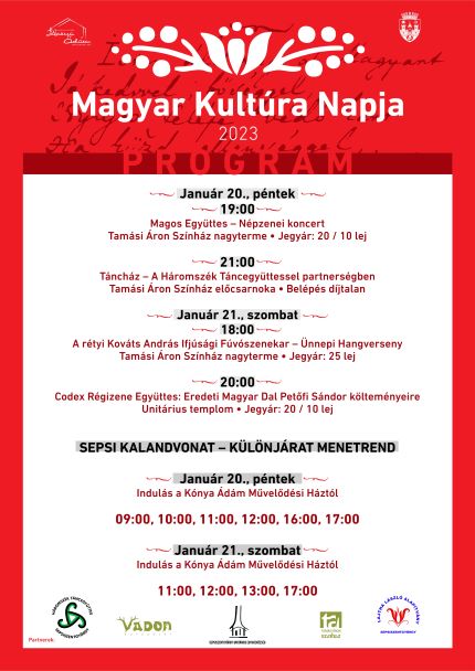 A Magyar Kultúra Napja alkalmából kétnapos program-sorozattal indul a 2023-as év kultu-rális rendezvényei-nek kínálata Sepsiszentgyör-gyön. A Kónya Ádám Művelődési Ház, valamint Sepsiszentgyörgy önkormányzata közös szervezésében létrejövő események sorát január 20-án a Magos Együttes népi zenekar koncertje nyitja meg a Tamási Áron Színház nagytermében, 19:00 órai kezdettel.