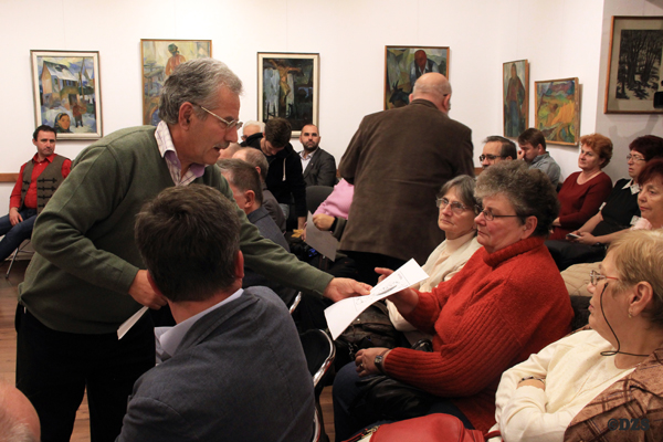 Barabás László (balra) Sóvidék-térképeket osztott a közönség tagjainak