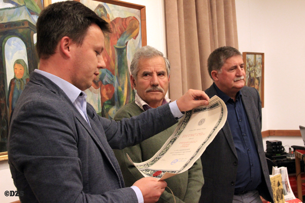 A Kriza János Néprajzi Társaság életműdíját Jakab Albert Zsolt (balra) adta át Barabás Lászlónak (középen), akit Pozsony Ferenc méltatott (jobbra)