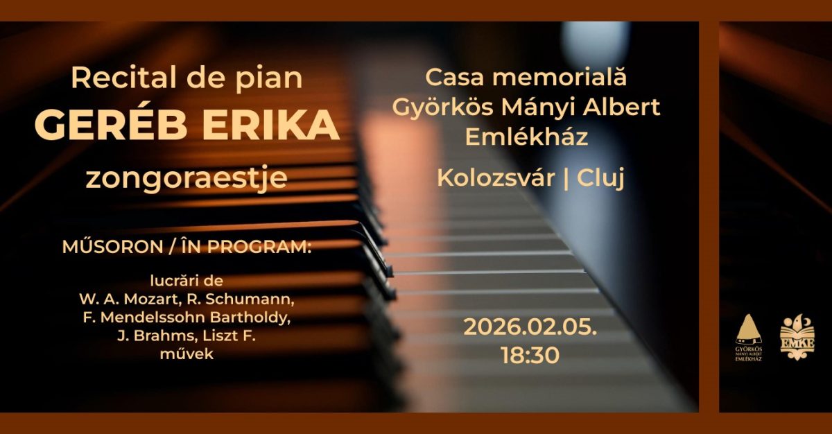 Geréb Erika zongoraestet tart február 5-én, csütörtökön, 18:30-tól az EMKE Györkös Mányi Albert Emlékházában (Kolozsvár, Republicii/Majális u. 5.). Műsoron: W. A. Mozart: d-moll Fantázia; R. Schumann: 5 darab az Ifjúsági albumból; F. Mendelssohn Bartholdy: Dalok szavak nélkül; J. Brahms: Intermezzók; J. Brahms: Ballada op.118 nr. 3; Liszt F.: Vigasztalások 1-3.