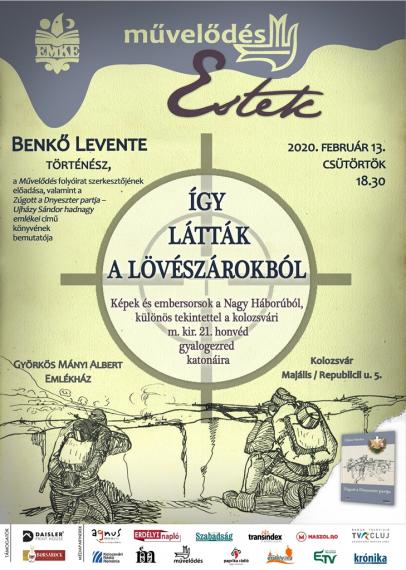 Így látták a lövészárokból – képek és embersorsok a Nagy Háborúból, különös tekintettel a kolozsvári m. kir. 21. honvéd gyalogezred katonáira címmel tart előadást Benkő Levente történész, a Művelődés folyóirat szerkesztője a Művelődés Estek-sorozat keretén belül 2020. február 12-én, csütörtökön 18.30-tól. Az est házigazdája Dáné Tibor Kálmán, a Művelődés folyóirat főszerkesztője, az előadást ezúttal is a Györkös Mányi Albert Emlékházban (Kolozsvár, Republicii/Majális u. 5.) tekinthetik meg.