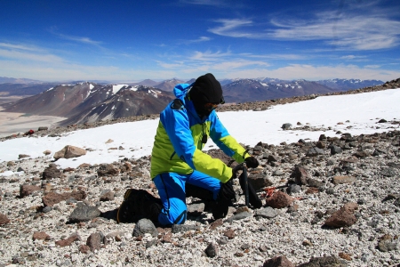 HZs: Maga az Atacama-sivatag az egyik legszárazabb terület a Földön, kutatásunk helyszínétől nem túl messze található a Föld legszárazabb pontja, de ugyanitt mérték a legnagyobb szélsebességet is. Ez nemhivatalos adatok szerint 400 km/óra körüli sebességet jelent. Az Ojos del Salado a Puna de Atacama fennsíkból emelkedik ki, sok más 6000 méternél magasabb vulkáni kúp társaságában. Januártól márciusig lehet megközelíteni, mi is erre az időszakra szerveztük az expedíciónkat. Az itt végzett kutatásoknak van egy megkerülhetetlen előfeltétele: el kell oda jutni műszerekkel és felszereléssel együtt, ami természetesen pénzbe kerül. Én magam a pénzügyekért is felelős szervezője voltam az expedíciónak, a szponzorok felkutatása pedig az egyik legnehezebb szervezési feladat, az összegyűlt pénz mennyiségétől függ ugyanis, hogy mire tudunk költeni. Kutató barátaink rendkívül sokoldalú tervet álítottak össze, sokmilliós műszerigénnyel, és azon igyekeztünk, hogy a lehető legtöbbet sikerüljön ebből megvalósítani. Tárgyaltunk például egy fejlesztő céggel is, amely geoelektromos mérésekre alkalmas műszert fejlesztene nekünk. Ez a berendezés vezetőképesség-mérés segítségével vizsgálja a felszín alatti rétegek a szerkezetét, ami azért lenne nagyon hasznos, mert mi az örökfagy, a permafroszt kiterjedését és annak változásait mérjük. Ez a felszín alatti fagyott réteg érzékenyen reagál a klíma változásaira, növekedése és fogyása kicsit hasonlít a gleccserek növekedéséhez és fogyásához – persze nagyon leegyszerűsítve igaz a párhuzam.