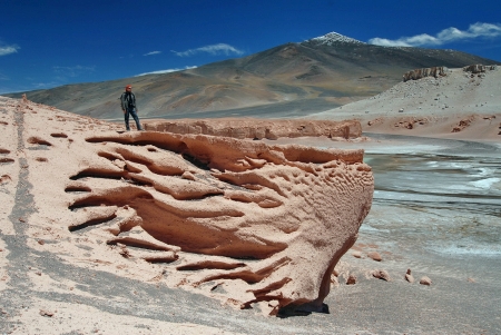HZs: Útban az Ojos del Saladóra található egy akklimatizációs táborhely 4350 méteren, a Laguna Verde partján. Ez a helyszín olyan, mintha Dalí vásznáról mászott volna le: rózsaszíntől a fehéren át az azúrkékig itt mindenféle szín megtalálható. Állítom, hogy a helyiek jóvoltából itt használható a világ legszebb panorámájával rendelkező árnyékszék vulkánnal, kék tóval és rózsaszín sziklákkal. Ebben a mesés környezetben vannak azok a melegvizű források, amelyek a vulkáni eredetnek köszönhetőek, és amelyek a tó vizét is táplálják. A bennük lévő mikroorganizmusok a vöröstől a narancsig mindenféle színűre festik a termálvíz-bugyogásokat, és persze van egy-két kővel körberakott kis medence is, ahol egy-egy fagyos estén 36 fokos termálvízben ücsörögve lehet szemlélni a világ legtisztább égboltját. Nem kell csillagásznak lenni ahhoz, hogy az ember ott fekve megértse, miért telepítenek oly sok obszervatóriumot az Atacama-sivatagba. Kevés olyan magashegyi környezet van a világon, amelynek csillagászati szempontból ennyire jó adottságai lennének, egyrészt a rendkívül alacsony páratartalom, a ritka és nagyon tiszta levegő, másrészt a nagy kiterjedés miatt. Ide például sehonnan sem jut el a nagyvárosok esti fényszennyezése. Természetesen az Ojos del Saladóra szervezett kutatóexpedíciónknak is a Laguna Verde partján eltöltött akklimatizációs periódus volt az egyik fénypontja. Kint süvített a mínusz fokos szél, mi pedig a termálvízben elmélkedtünk és bámultuk a Tejutat, amelynek nagyon más a látványa, mint innen, Európából bárhonnan nézve. Az élmény szavakkal leírhatatlan.