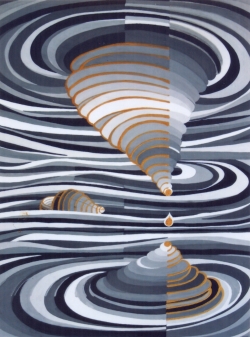 Mindezek után örvendek, hogy a Klubgalériában kiállítást rendezhetek op-art képeiből, méghozzá újabb, 2013-as alkotásaiból. Míg korábbi korszakában vonalzóval és körzővel szerkesztette a hideg ipari táj kompozícióit (csövek, drótok, kémények, kohók, ipari csarnokok egyenesei, párhuzamosai), a mostaniakban elszabadultak az indulatok. Hullámzanak, forognak, örvénylenek, kavarognak, gomolyognak, lüktetnek, kitörnek a formák, s mindezt már szabadkézzel készítette. Ehhez az aprólékos, pontos munkához teljesen biztos kézre van szükség. Az ember azt hinné, hogy az egyenletes, dekoratív felületekhez szórópisztolyt használ, pedig az egész látvány különleges ecsetekkel és a tempera egyenletes eldolgozásával készül. Ez nem a folthatásos technika. Struktúráit, mint egy mesterember, szálanként szövi, fonja, vagy szabályos mértani formákból teremt modern mozaik felületeket. A kezdetek sok párhuzamosát felváltják a csokorba, kévékbe, nyalábokba fogott csíkárnyalatok. Képei gyakran monokróm skálázással készültek, helyenként ritmikus okker hangsúlyokkal, szikrákkal erősítve az ívelt, dinamikus, mozgó formákat. De megjelentek munkái között az ún. színes-szürkékben komponált képek is, lila, piros, zöld, kék, barna színek kombinációival. A sík és tér társításában ez utóbbi kap nagyobb hangsúlyt. Szeret játszani az ellentétekkel, a szimmetriával és az aszimmetriával, a pozitív és a negatív formákkal, a teli és az üres részekkel, a kidudorodó és a horpadt, a meleg és a hideg felületekkel, a fénnyel és az árnyékkal, a statikus és a dinamikus szerkezetekkel. Mérnöki pontossággal és technikai bravúrral megoldott képein gyakran az aranymetszés szabályait is felfedezhetjük.