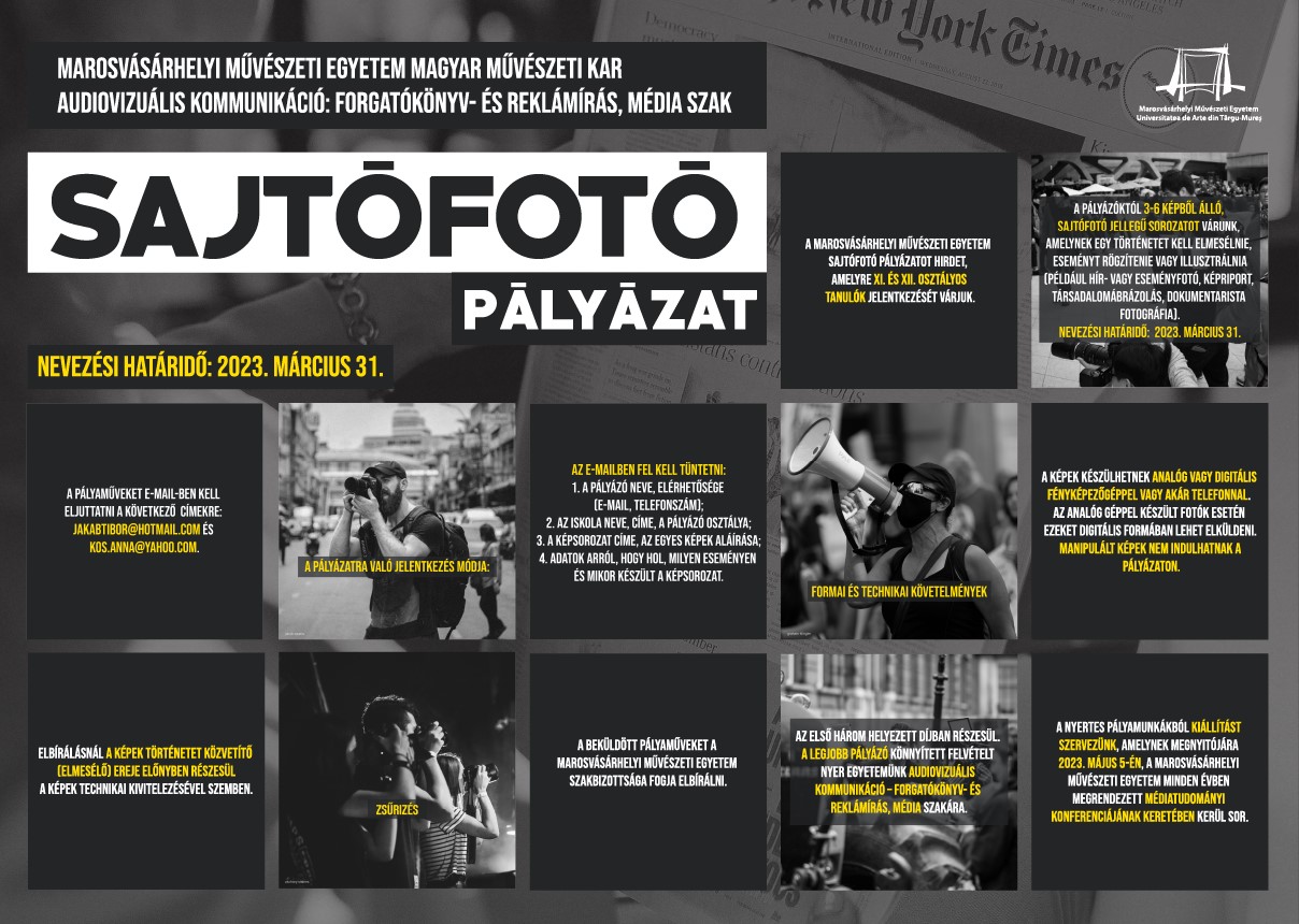 A Marosvásárhelyi Művészeti Egyetem sajtófotó pályázatot hirdet, amelyre XI. és XII. osztályos tanulók jelentkezhetnek. A pályázóktól egy 3-6 képből álló, sajtófotó jellegű sorozatot várnak, amelynek egy történetet kell elmesélnie, eseményt rögzítenie vagy illusztrálnia (például hír- vagy eseményfotó, képriport, társadalomábrázolás, dokumentarista fotográfia). Nevezési határidő: 2023. március 31.