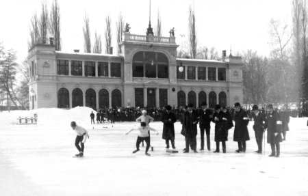 A korcsolyázás elterjedésével együtt megnőtt a nézők száma is, akik kijöttek a tópartra. Szükség volt egy olyan korszerű épületre, ahol a nézők megmelegedhettek, ahol fűtött helyiségből követhették figyelemmel a korcsolyázást. Az első kis épület, amelyet még az 1870-es években emeltek, nem volt megfelelő már akkor, hiszen a kis bódé bakterháznak jó lehetett, de egyébre nem volt alkalmas. Erről a Magyar Polgár című lap 1875. december 12-i számában ad részleteket.