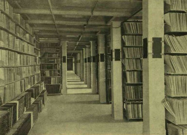 A szintén elkülönített kilencemeletes raktárépület a modern könyvtárépítészet egyik remeke. A klinkertéglával burkolt repozitórium 45 méter hosszúságú termein karcsú vasbeton oszlopok sorakoznak fel, arányosan elosztva a könyvek százezreinek súlyát. Az épület földszintjén és két emeletén építettek két-két félemeletet, a jobb megvilágítás érdekében a raktári termeket vízszintesen kettéosztja egy vassínhálózatra fektetett belga drótüveg mennyezet. A raktárt hosszában három rekeszre osztották, amelyeket tömör ajtók választanak el egymástól, így tűz esetén mindig csak egy cella anyaga foroghat veszélyben. A rendszer a tengerjáró hajókba épített vízzáró rekeszekre emlékeztet, amelyek a hajótest sérülése esetén is biztosítják az úszóképességet.