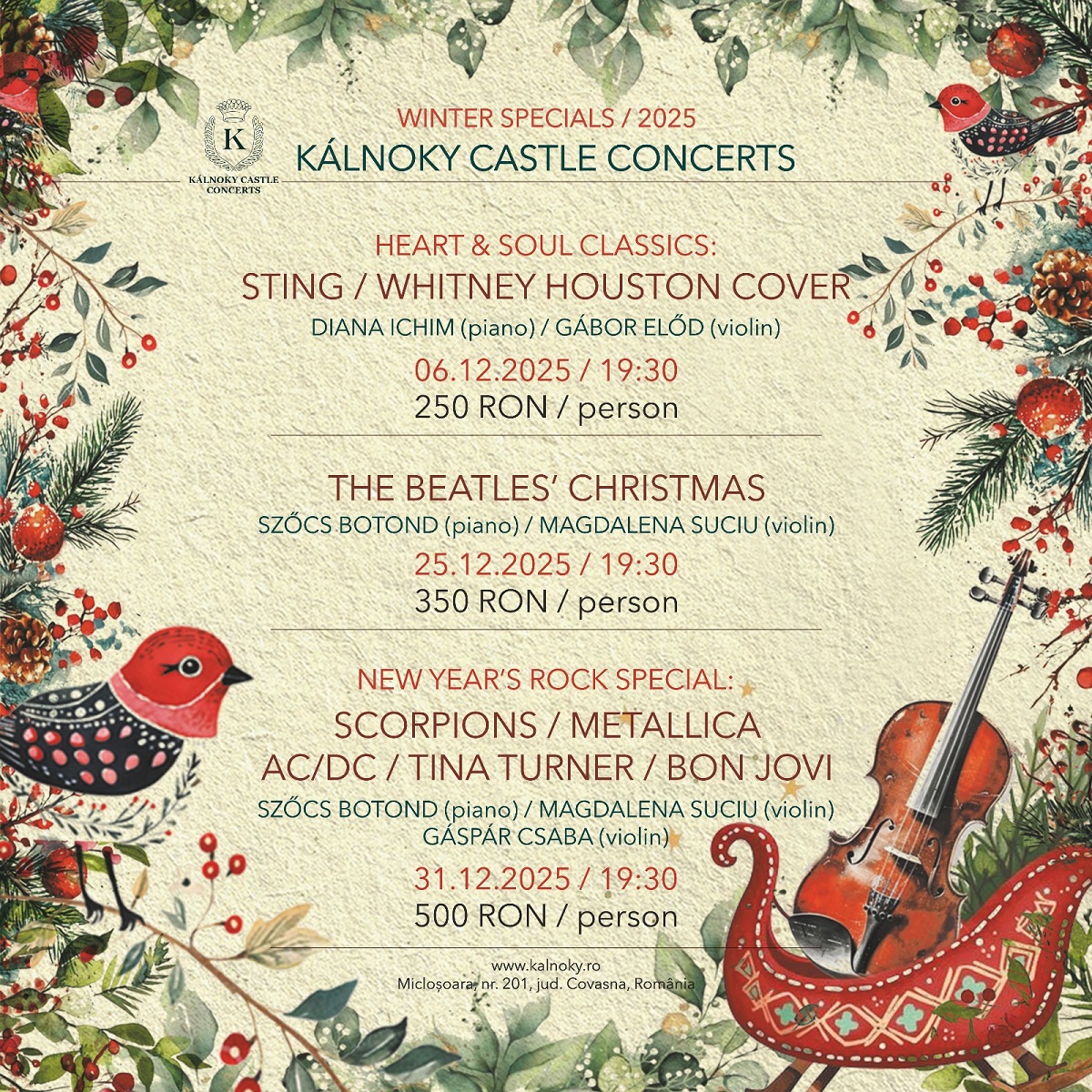 A Kálnoky Castle Concerts decemberi koncertjei az ünnepek varázsát hozzák el a miklósvári kastély falai közé. A Winter Specials három különleges esttel ünnepli a karácsonyt és búcsúztatja az évet: meghitt, gyertyafényes hangulatban, ahol a klasszikus zene találkozik a pop, a soul és a rock ikonikus dallamaival.